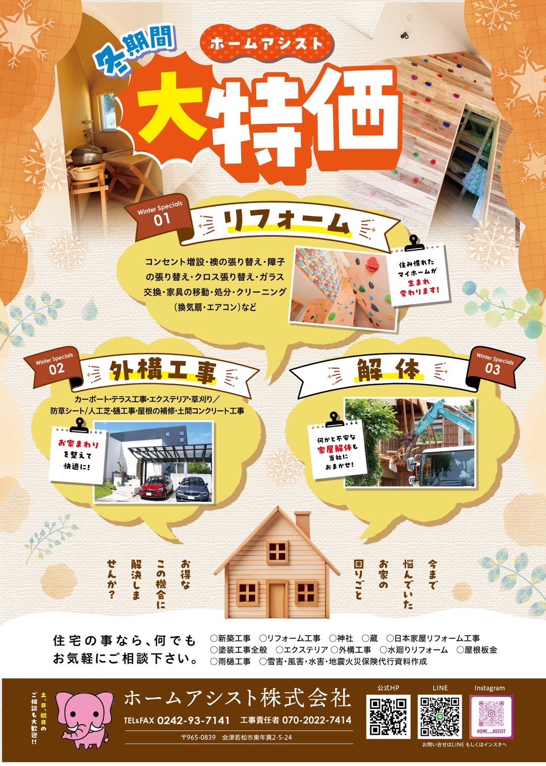 只今、冬期間割引実施中です。期間2024年1月~2024年3月までのお問い合わせですのでお早目にお願い申し上げます。